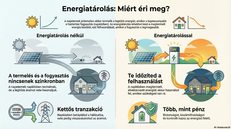 Energiatárolás nélkül ilyenkor a napközben megtermelt energiát betápláljuk, este pedig visszavásároljuk.
